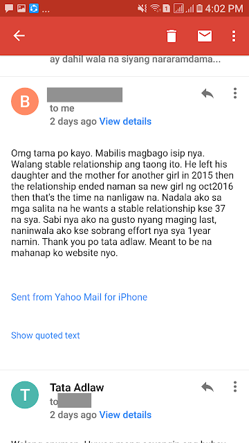 Omg tama po kayo. Mabilis magbago isip nya. Walang stable relationship ang taong ito. He left his daughter and the mother for another girl in 2015 then the relationship ended naman sa new girl ng oct2016 then that's the time na nanligaw na. Nadala ako sa mga salita na he wants a stable relationship kse 37 na sya. Sabi nya ako na gusto nyang maging last, naninwala ako kse sobrang effort nya sya 1year namin. Thank you po tata adlaw. Meant to be na mahanap ko website nyo.